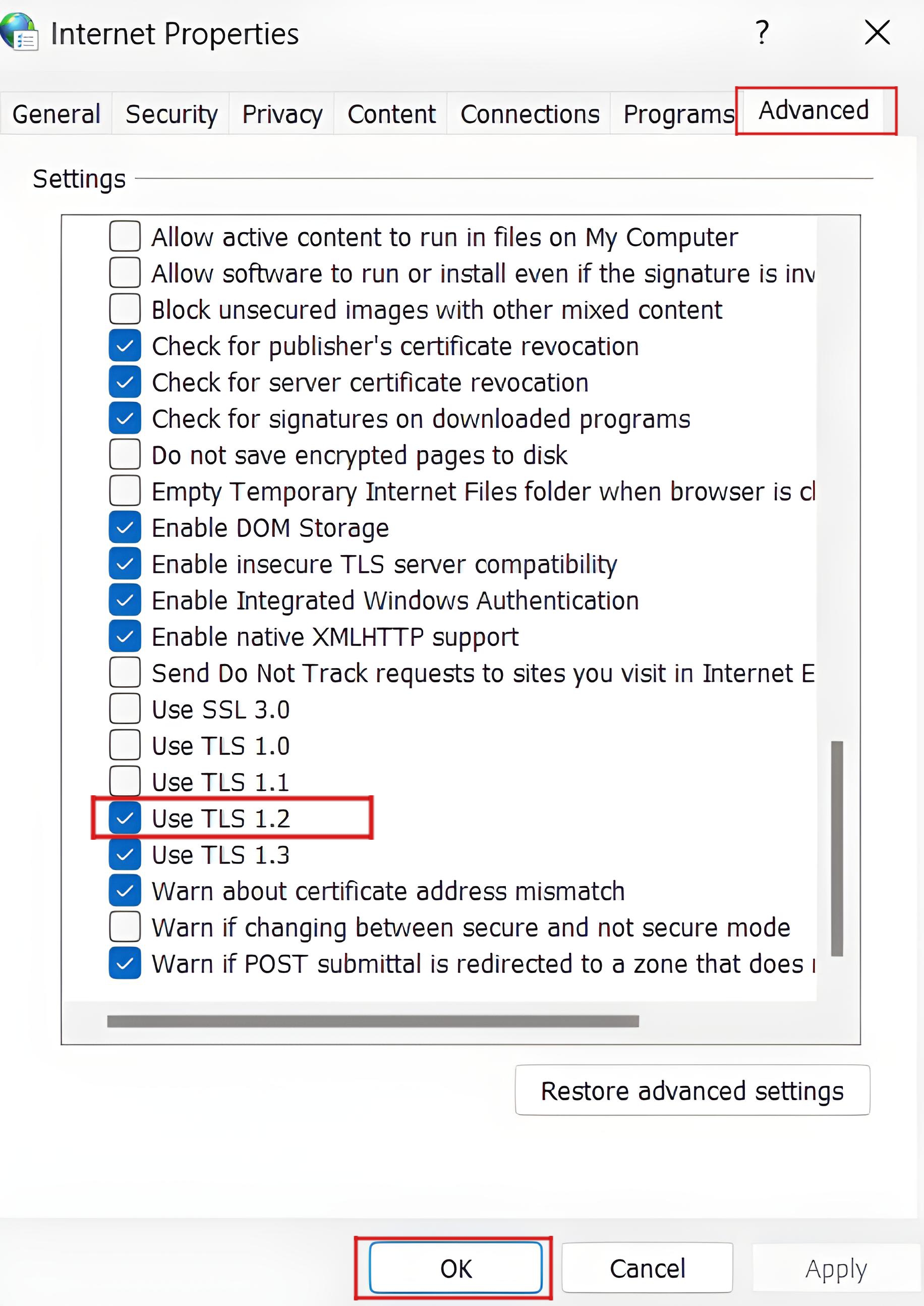 3. Enable the checkbox for TLS 1.2 and click OK.